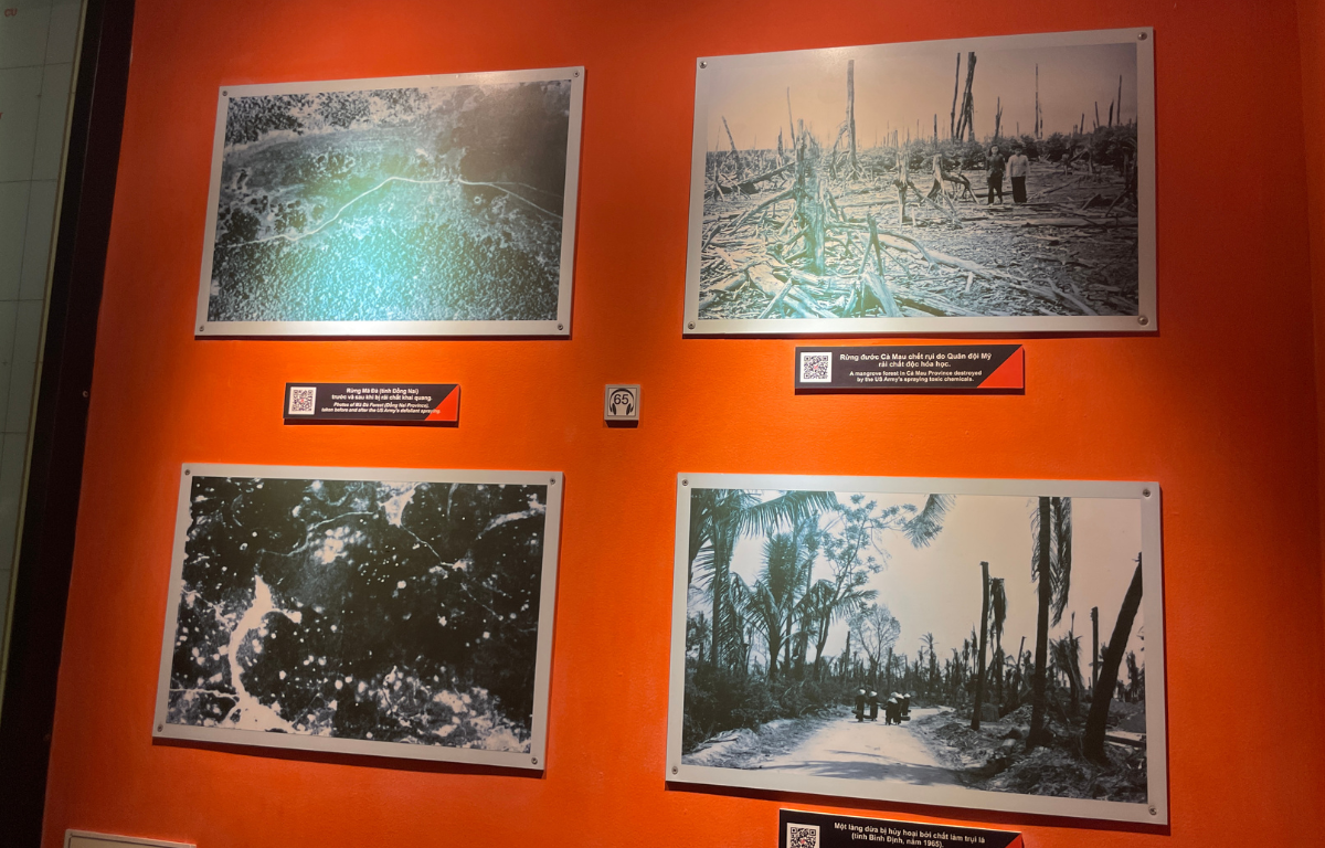 散布前と散布後の土地の比較画像や、破壊されたマングローブの写真が展示されています。