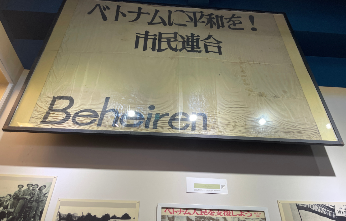 日本からも多くの支援が寄せられ、山崎博昭氏をはじめとする反戦活動家の紹介、反戦を訴える旗やデモの記録写真が展示され、各国の連帯の様子が伝えられています。