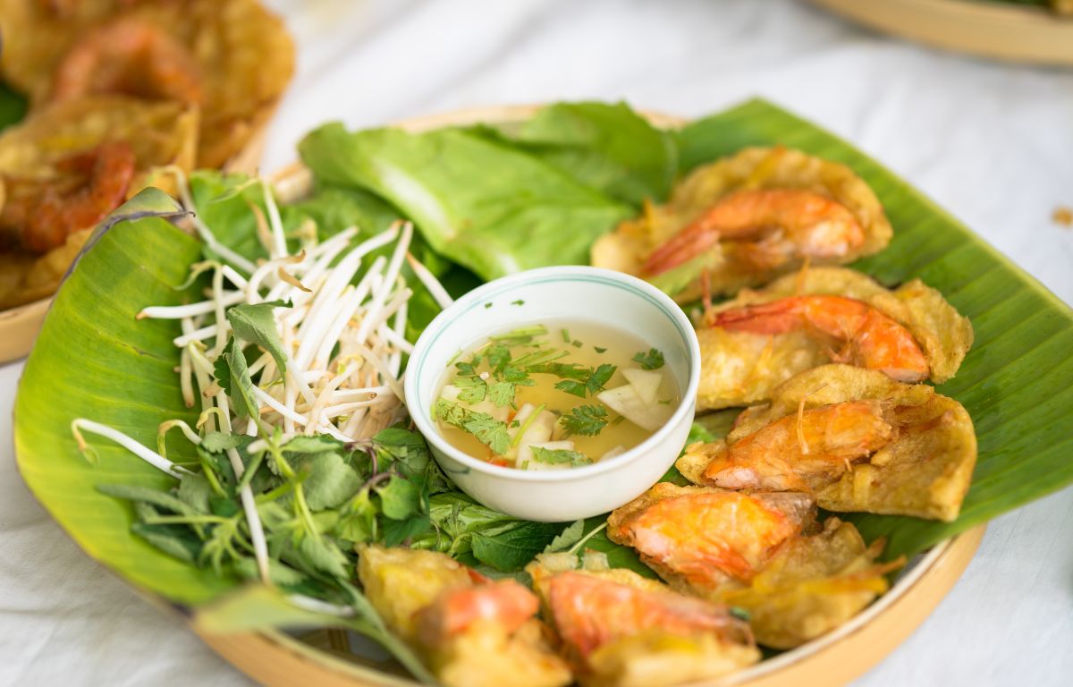 バインセオは、魚醤や香草と一緒に食べることで、脂っこさを和らげ、さっぱりした味わいを楽しむことができます。中部のバインセオはやや小さめで、南部のものは大きく、ココナッツミルクが使われています。