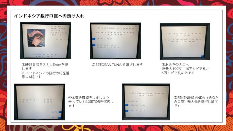 ちなみに私のATMの使い方は、日本の銀行口座からの現金引き出し&インドネシアの銀行口座への預け入れのみで利用しています。