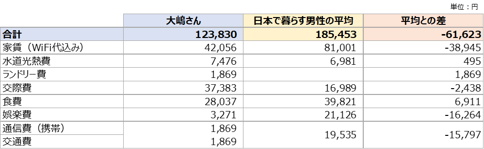 こちらの表から、大嶋さんの生活費は日本で暮らす男性の平均額より61,512円低いことが分かります。