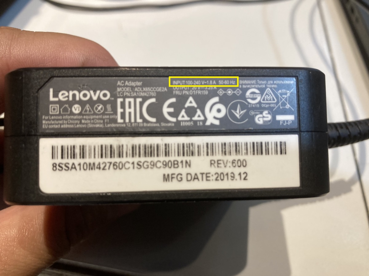 パソコンなどは画像のように「100V~240V」と記載があれば問題なく使えますので、お使いの電化製品をチェックしてみてくださいね。