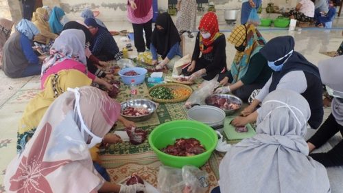 開催場所はモスク(礼拝所)で行われ、男性は皮を剥いだり、骨を切ったり力仕事を。女性は男性が捌いたお肉を小分けにしたり、料理の準備に取り掛かります。