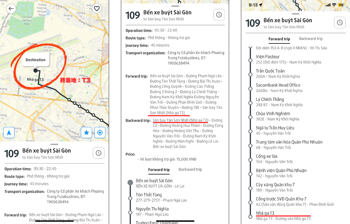 ホーチミン市内のバス情報が確認できる「Go!Bus」アプリで調べたところ、109番のバスが“T3まで就航している”との表示を確認。