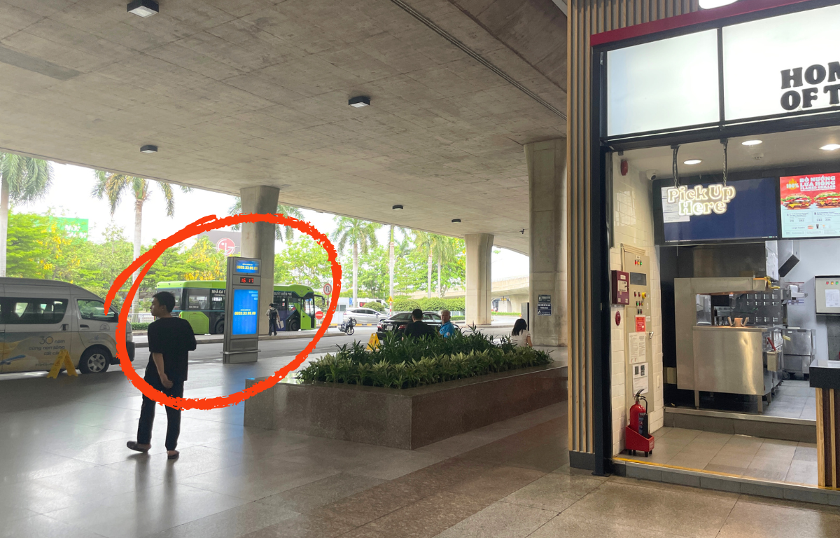 シャトルバスは、T2の到着出口を出て右奥、バーガーキング付近に停車します。国際線から国内線に乗り継ぐ方は、この場所でバスを待つことになります。