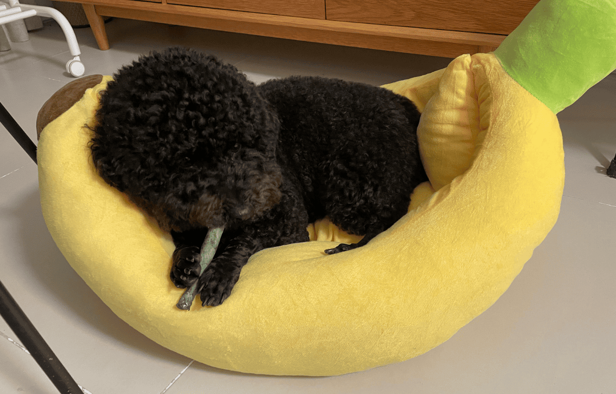 以下はYさんの愛犬の写真です。Shoppeで購入されたというバナナのベッドが可愛らしいですね!