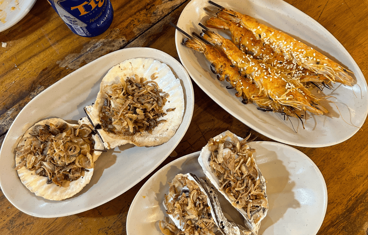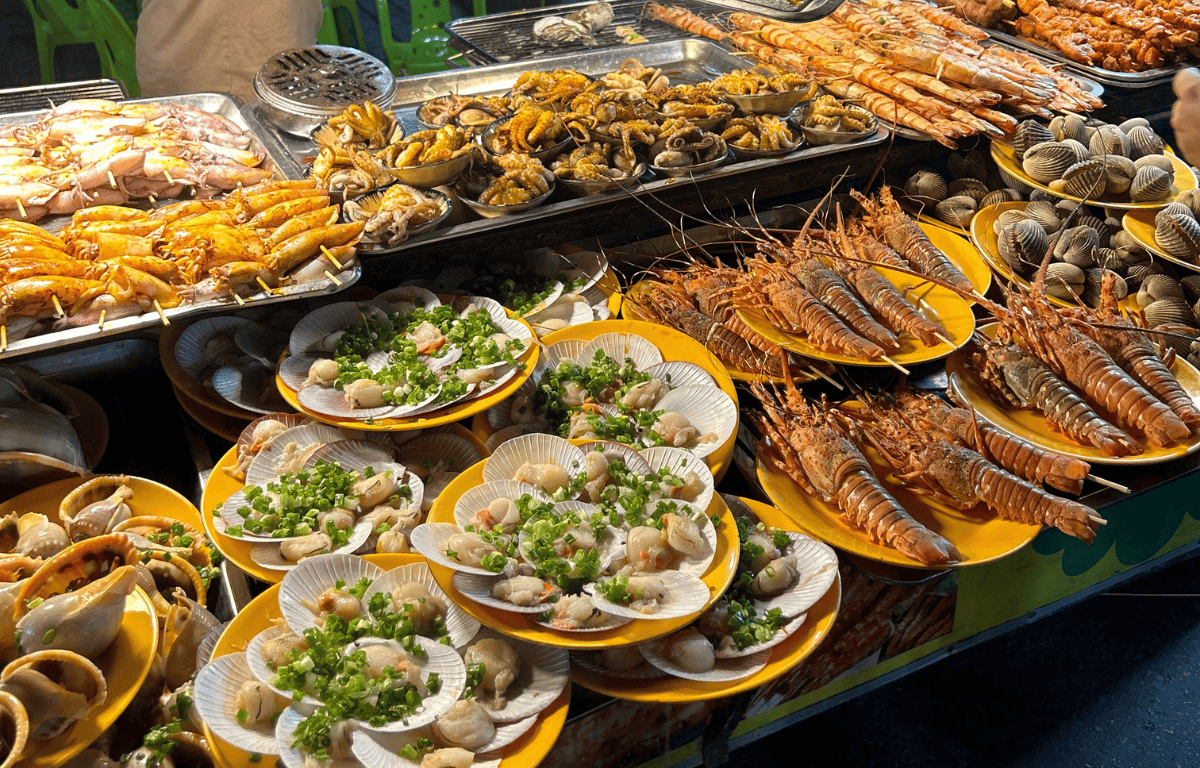 屋台に並んでいる海鮮を食べる場合は、屋台から好きな海鮮を選び、食べたい個数を店員に伝えるスタイル。そうすると、その場で焼いたものを席まで運んできてくれ、焼き立て熱々のものをいただくことができます。