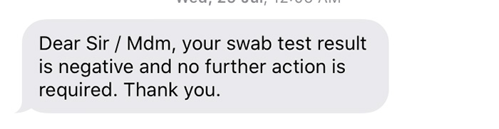 テスト終了後はどこにもよることなく帰宅し、36時間後くらいにMOMからSMSで結果が通知されます。陰性だと下記のようなメッセージが届きます。ここでようやく、ほっとします。