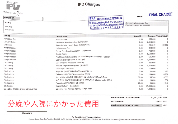 硬膜外麻酔での無痛分娩、そして4泊5日の入院でトータル40,475,821VND(約200,000円くらい)でした。現金でもカードでも支払いが可能です。