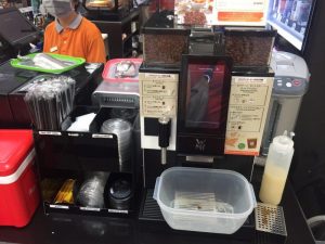 レタントン店の個人的に嬉しいポイントは、このコーヒーマシン!日本語が書いてありますね。レジでお金を払うと、注文に応じたカップを渡されます。そこからは日本と同じで、自分でボタンを押して飲み物が出てくるのを待つシステム。氷が必要な場合は、マシン横の赤いクーラーボックスから出して好きな量を入れます。