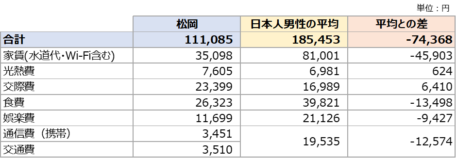 費目別でみると、家賃と食費は特に日本人男性の平均値よりとても低く抑えられています。