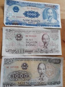 こちらが、ベトナムでよく出回っている紙幣です。200ドン、500ドンの紙製もありますが、会計時に受け取ってもらえない場合もあるので除きます。(このお金としてかわいそうな扱いをされている2種類は、よくスーパーやお寺などの寄付金箱などに入っていることが多いです・・・。)
