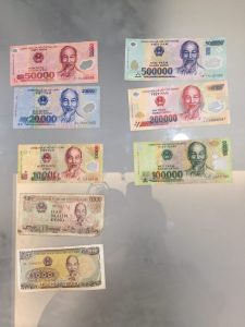主に紙幣が使われています。1,000ドン札、2,000ドン札、5,000ドン札、10,000ドン札、20,000ドン札、50,000ドン札、100,000ドン札、200,000ドン札、500,000ドン札があります。