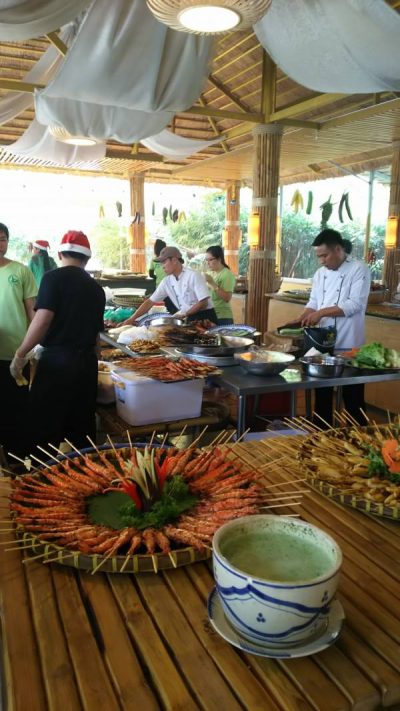 バンブービレッジは入場料が330,000VND。日本円でだいたい1600円くらいですね。お昼ごはん・朝ごはんが付いてます。といっても、強制宿泊ではないのでご安心を。お昼はブッフェで美味しいものやちょっと変わったものまで、存分にベトナム料理を楽しむことができます。