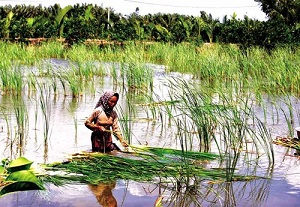 村の畑は浸水しているため、通常の作物は育ちません。そこでボンボン(Bon Bon)というベトナムの特産野菜を植えています。全長2メートルにも及ぶ巨大サイズで、浸水した畑でもしっかりと育ちます。根の部分を塩漬けにして食べると美味しいです。