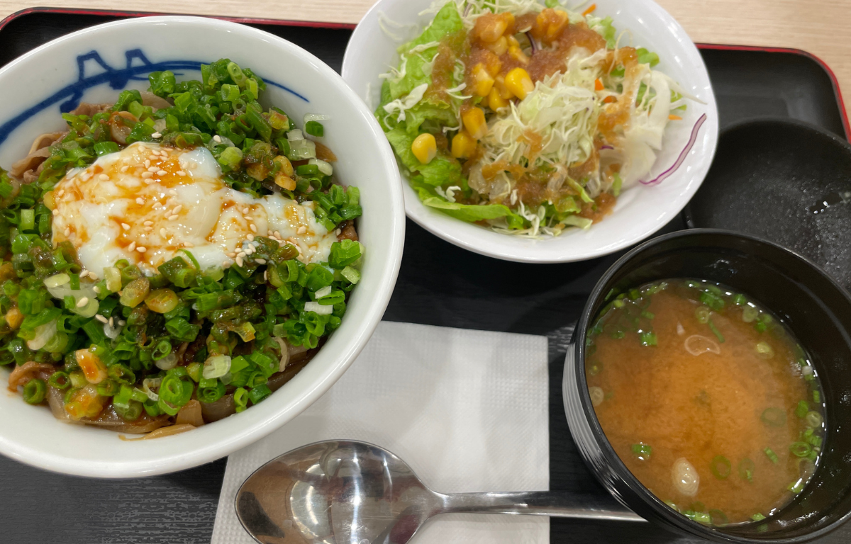 ねぎたま牛めし(サラダ、味噌汁付き)…75,000VND(約408円)