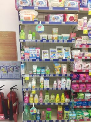 ベビー用品はおしり拭きやボディソープなど一通り揃っている印象です。熱冷まし用のシートは日本でもお馴染みの久光製薬のもの。生理用ナプキンもありました。ロリエもあります。