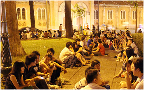 夜になると、教会の両側で1杯15,000ドン(75円)のコーヒーを販売する路上カフェと共に、友達同士でおしゃべりする若者で溢れかえっています。