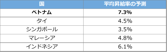 上記の表の通り、ベトナムの昇給率は東南アジア圏内のほかの国よりも高い予測値となっています。