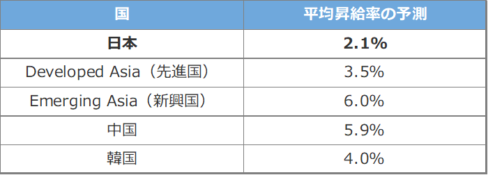 ほかのアジア圏の国々よりも、日本の昇給率(2.1%)は低く予測されていることが分かります。