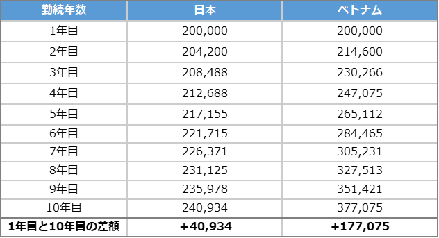1年目と10年目の給与額の差は、日本が+40,934円、ベトナムが+177,075円となり、その差はなんと約4.3倍。勤続年数が長くなればなるほど、差は大きくなっていきます。